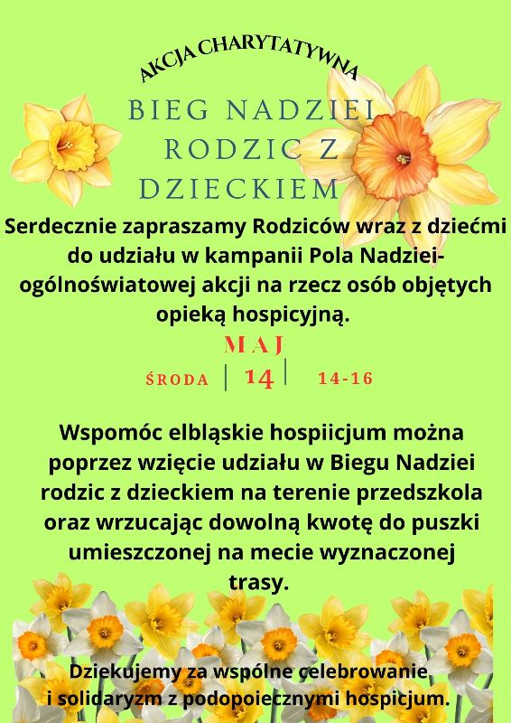 zachęcamy do wzięcia udziału w Przedszkolnym Biegu Nadziei – jest to wspólny bieg rodzica z dzieckiem oraz wrzucenie dowolnej kwoty do puszki umieszczonej na mecie wyznaczonej trasy.