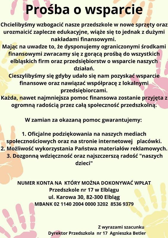 Zachęcamy elbląskie firmy oraz lokalne przedsiębiorstwa do wsparcia działań naszego przedszkola. Każda najmniejsza pomoc finansowa zostanie przyjęta z ogromną radością przez całą społeczność przedszkolną.